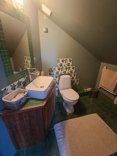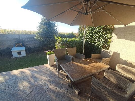 Od strony południowo-zachodniej znajduje się duży taras o powierzchni około 20 m², idealny do relaksu i spędzania czasu na świeżym powietrzu. Dom został wyposażony w nowoczesne instalacje: fotowoltaiczną oraz pompę ciepła, zamontowane na przełomie lat 2022/2023, co znacząco obniża koszty utrzymania nieruchomości i zwiększa jej energooszczędność.