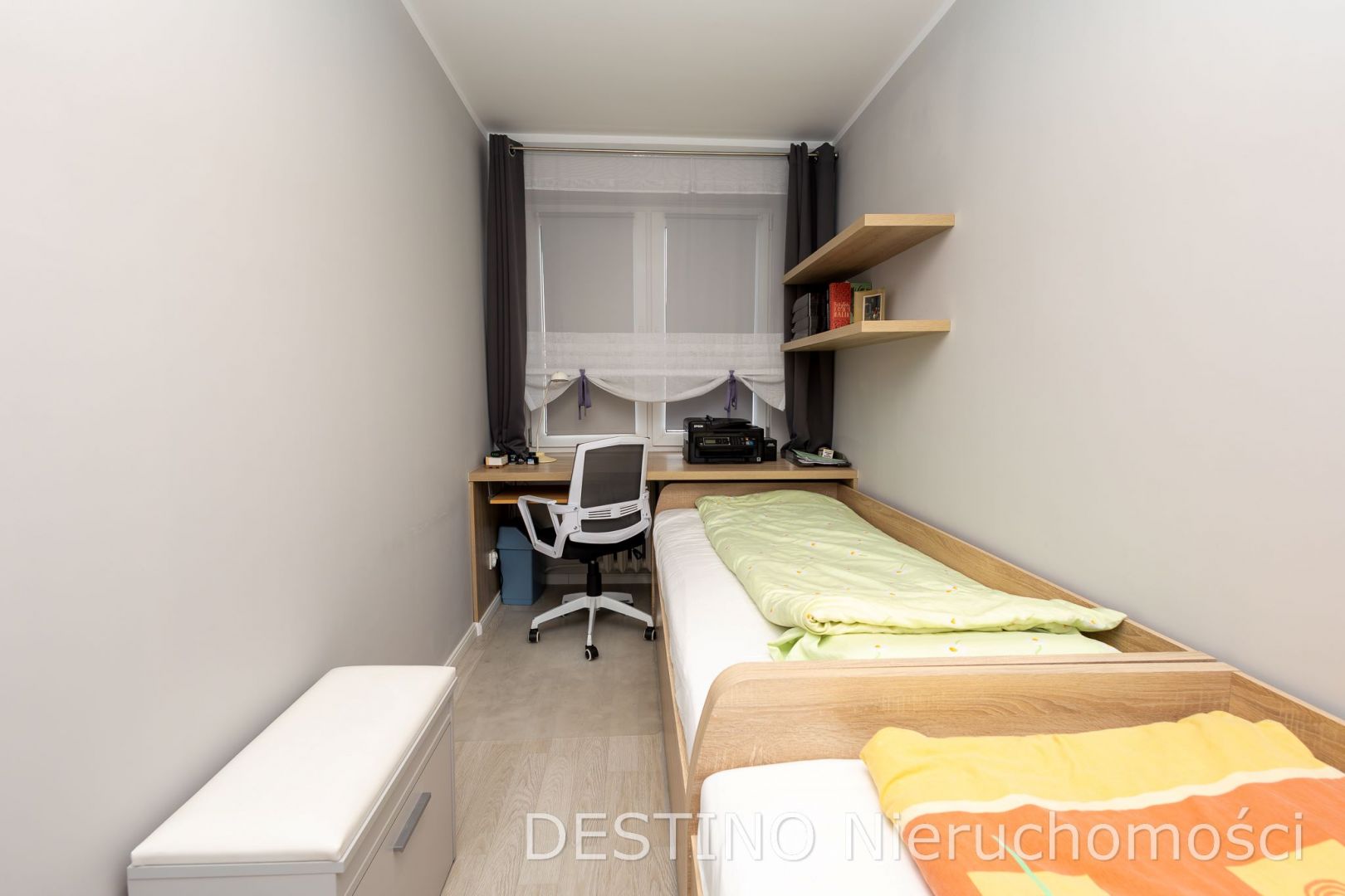 Okna PCV. Na podłogach panele i gres.