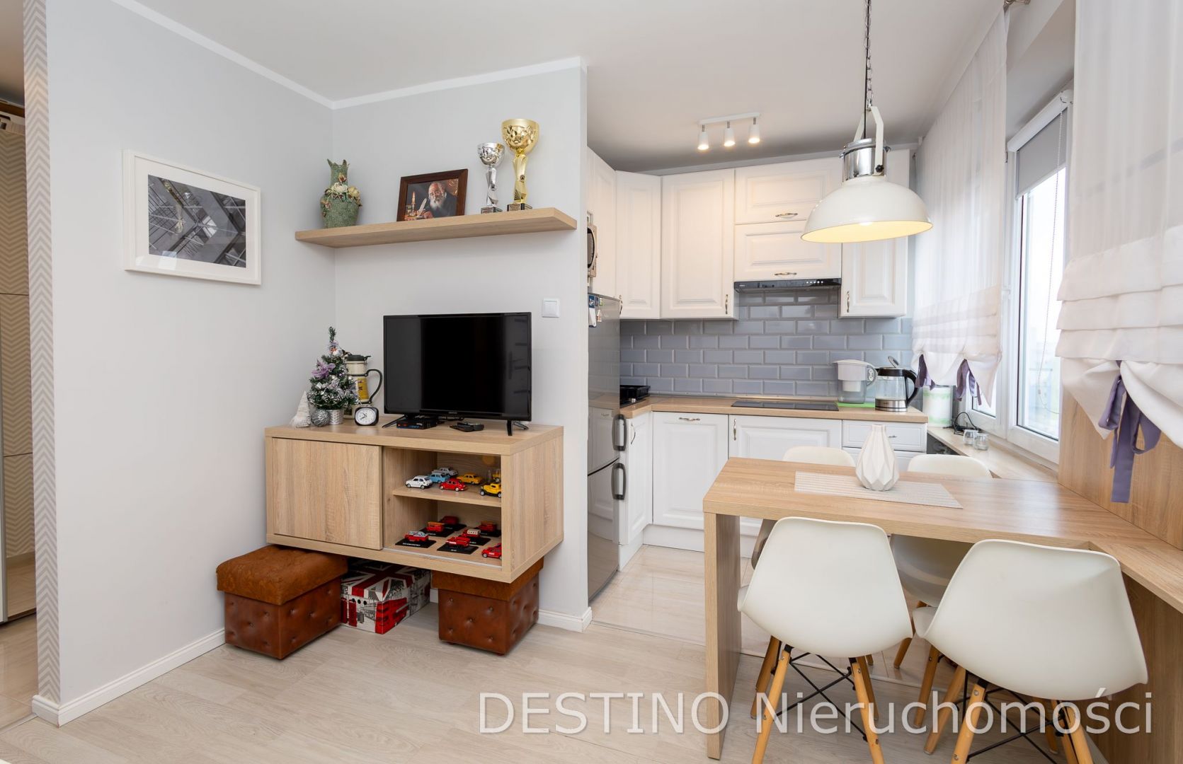 Kuchnia z meblami na wymiar i sprzętem AGD. W przedpokoju pojemna szafa. W mieszkaniu pozostaje przenośny klimatyzator.
