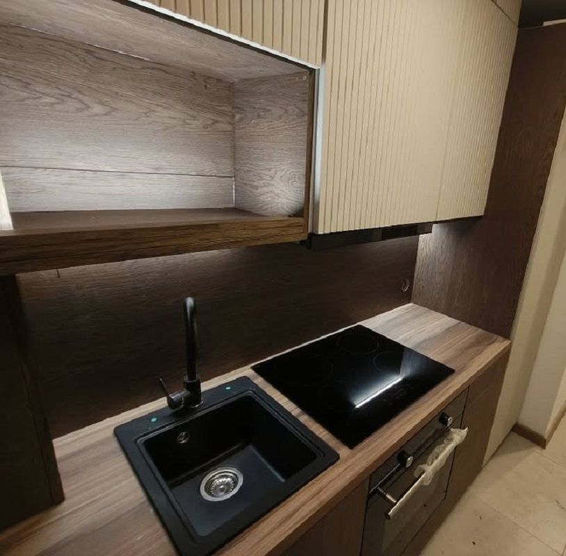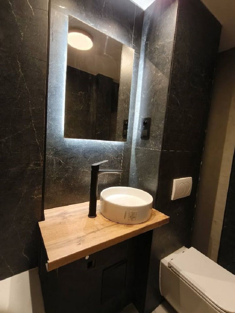 Kuchnia została wyposażona w meble w zabudowie oraz sprzęt AGD: płytę indukcyjną, piekarnik elektryczny oraz pochłaniacz. Łazienka urządzona estetycznie, z funkcjonalną wanną.
