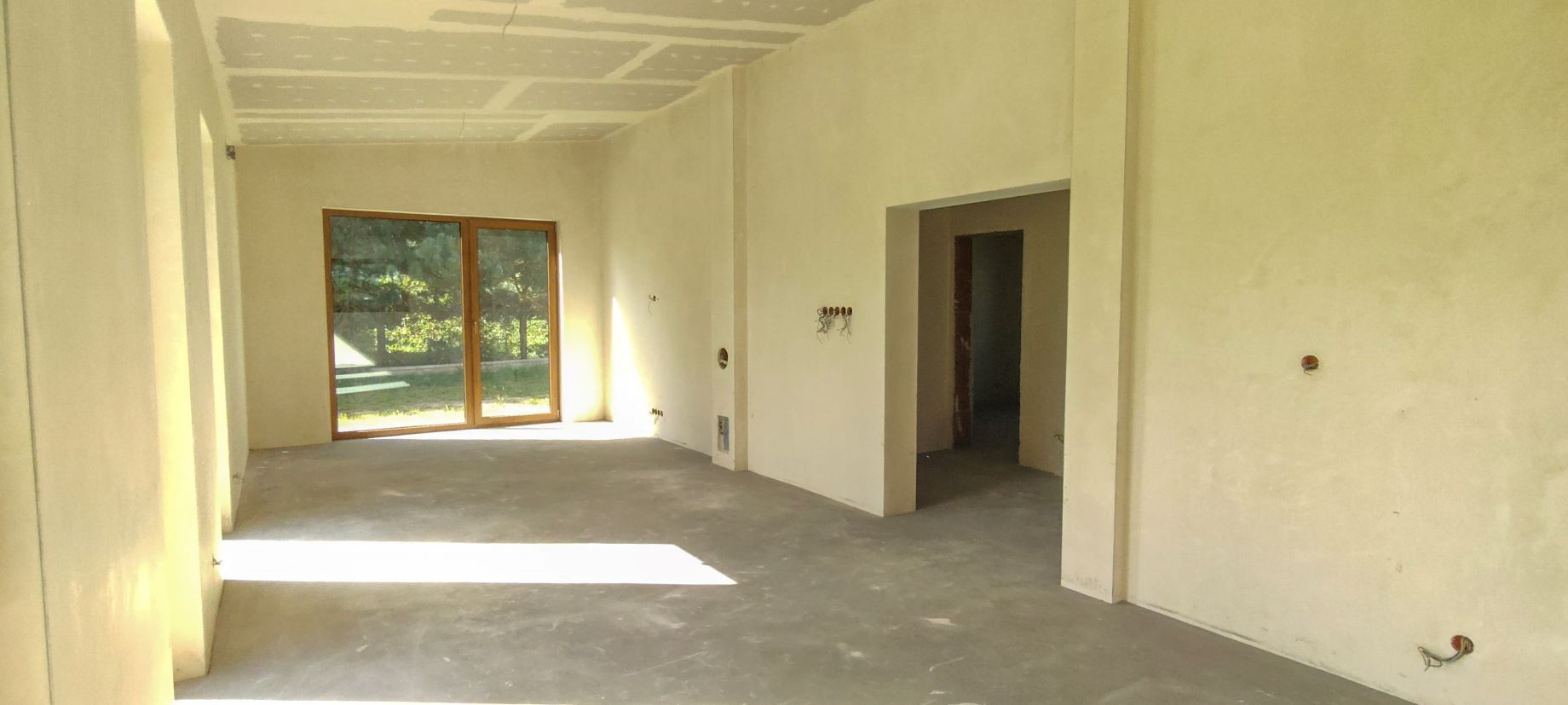 Przestronny salon z dużymi przeszkleniami i miejscem na aneks kuchenny